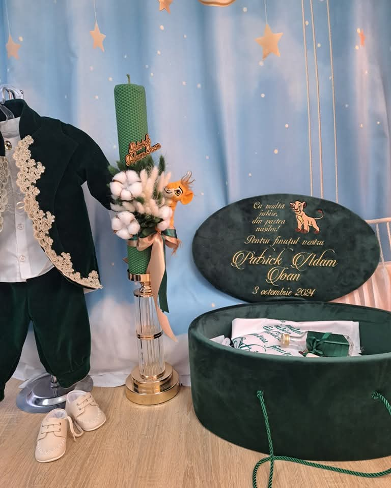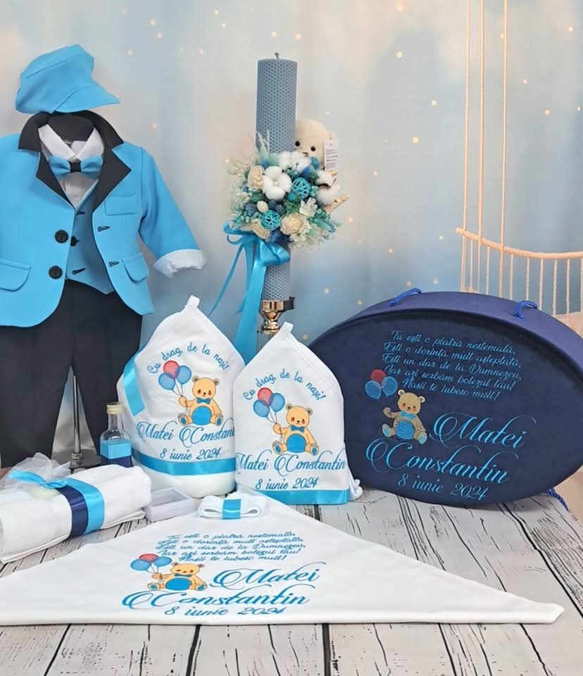 -Set complet biserica: Panza botez, fasa, pled bumbac cu capison, prosop bebe cu capison, sapun si prosop preot, cutie primul perisor, sticla de mir decorata, cufar oval buretat premium;